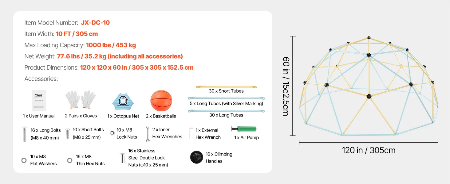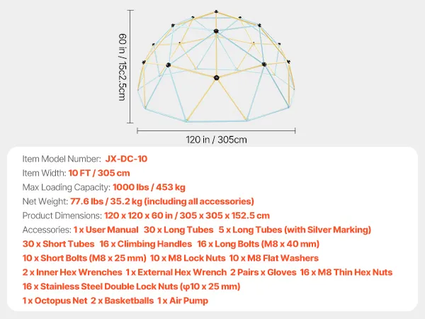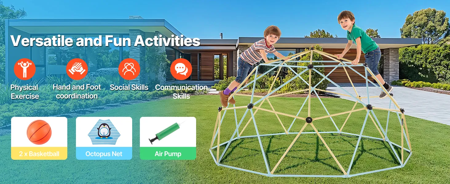 Let kids climb, explore, and grow stronger with our 10FT climbing dome. Featuring a stable structure, non-slip handles, 1000lbs loading capacity, 2 basketballs, an octopus ball net, and an air pump, it is perfect for boosting physical strength, coordination, communication and social skills.