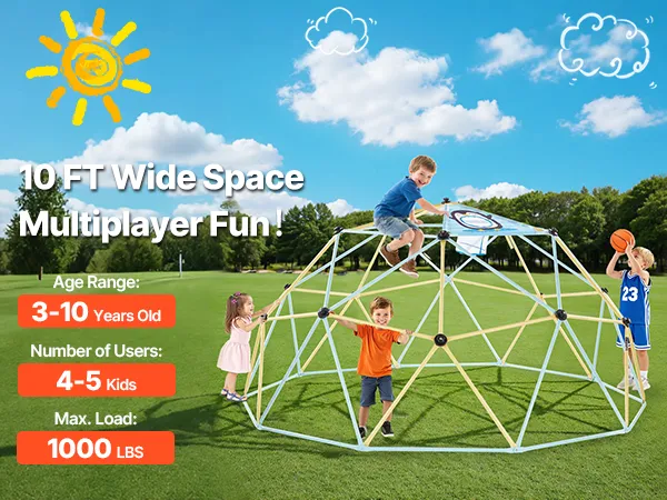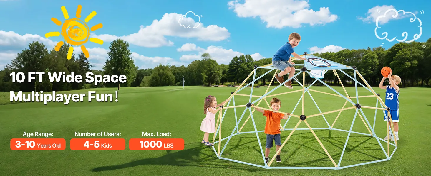 Play Freely, Grow Happily: This 10FT climbing dome is built for kids aged 3–10. It supports up to 1000 lbs (453 kg) and allows 4–5 children to play simultaneously. A great way to keep kids active outdoors, strengthen their bodies, and make friends while having fun