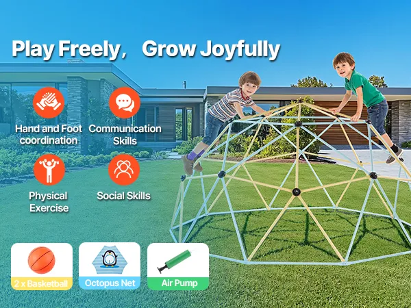 Vary the Fun: This jungle gym playset also includes 2 basketballs, an octopus ball net, and an air pump—offering kids more than just climbing fun. It helps strengthen bodies, satisfies their curiosity and sense of adventure, and promotes the development of social, teamwork, and communication skills