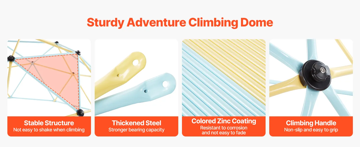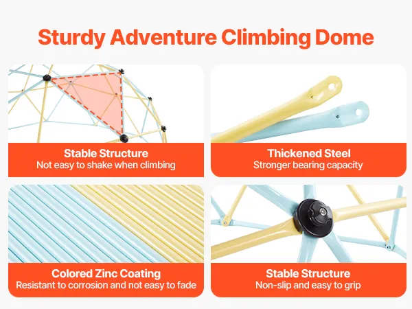 Sturdy & Stable Structure: Built with thickened steel tubes and stable triangular structure, this jungle gym dome climber stays stable and secure - without shaking or tipping as kids climb. The colorful zinc coating looks appealing and adds strong resistance to rust and corrosion - perfect for outdoor use