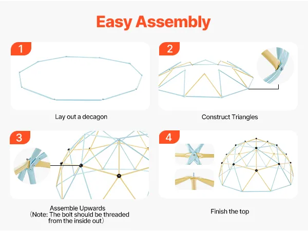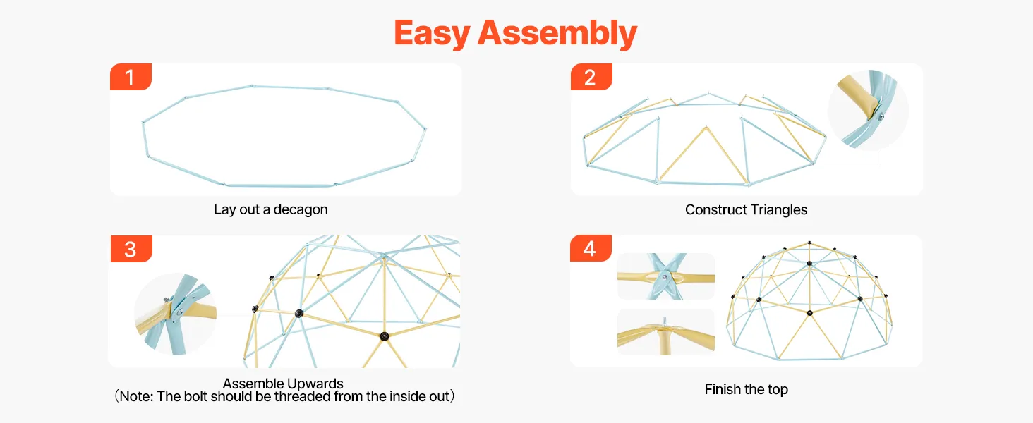 Our geometric dome climber comes with gloves, wrenches, and a detailed user manual. Two people can assemble it quickly, creating a fun-filled playground for your kids in just a few steps.