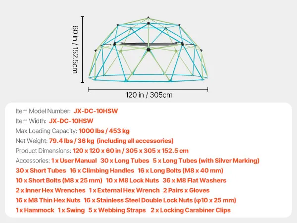 Let kids climb, play, explore, and grow stronger with our 10FT climbing dome. Featuring a stable structure, thickened steel tubes, non-slip handles, 1000lbs high loading capacity, a swing and hammock, it is perfect for boosting physical strength, coordination, communication and social skills.