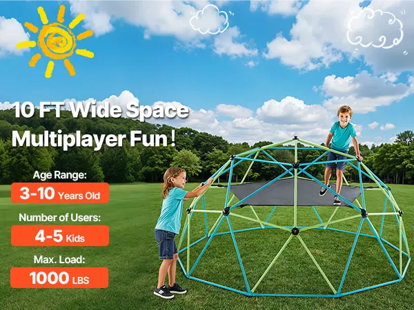 Play Happily, Grow Healthy: This 10FT climbing dome is built for kids aged 3–10. It supports up to 1000 lbs (453 kg) and allows 4–5 children to play simultaneously. A great way to keep kids active outdoors, strengthen their bodies, and make friends while having fun