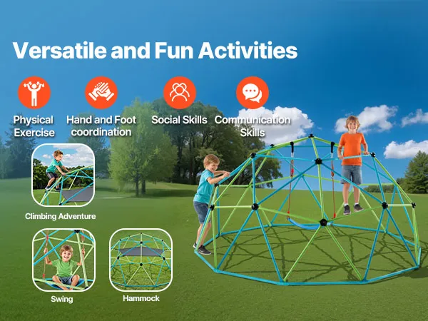 Keep the fun going with versatile play! This climbing dome playset also comes with a swing and hammock that adds more playing fun and excitement. A popular playground for kids during weekend parties and neighborhood gatherings.