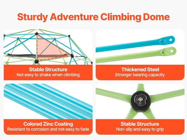 Sturdy & Stable Structure: Built with thickened steel tubes and stable triangular structure, this jungle gym dome climber stays stable and secure - without shaking or tipping as kids climb. The colorful zinc coating looks appealing and adds strong resistance to rust and corrosion - perfect for outdoor use