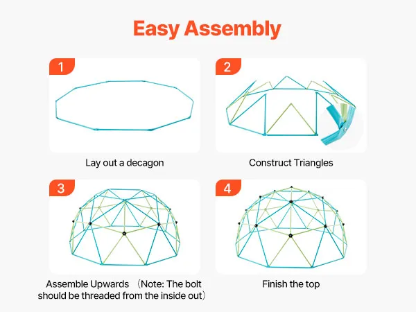 Our geometric dome climber comes with gloves, wrenches, and a detailed user manual. Two people can assemble it quickly, creating a fun-filled playground for your kids in just a few steps.
