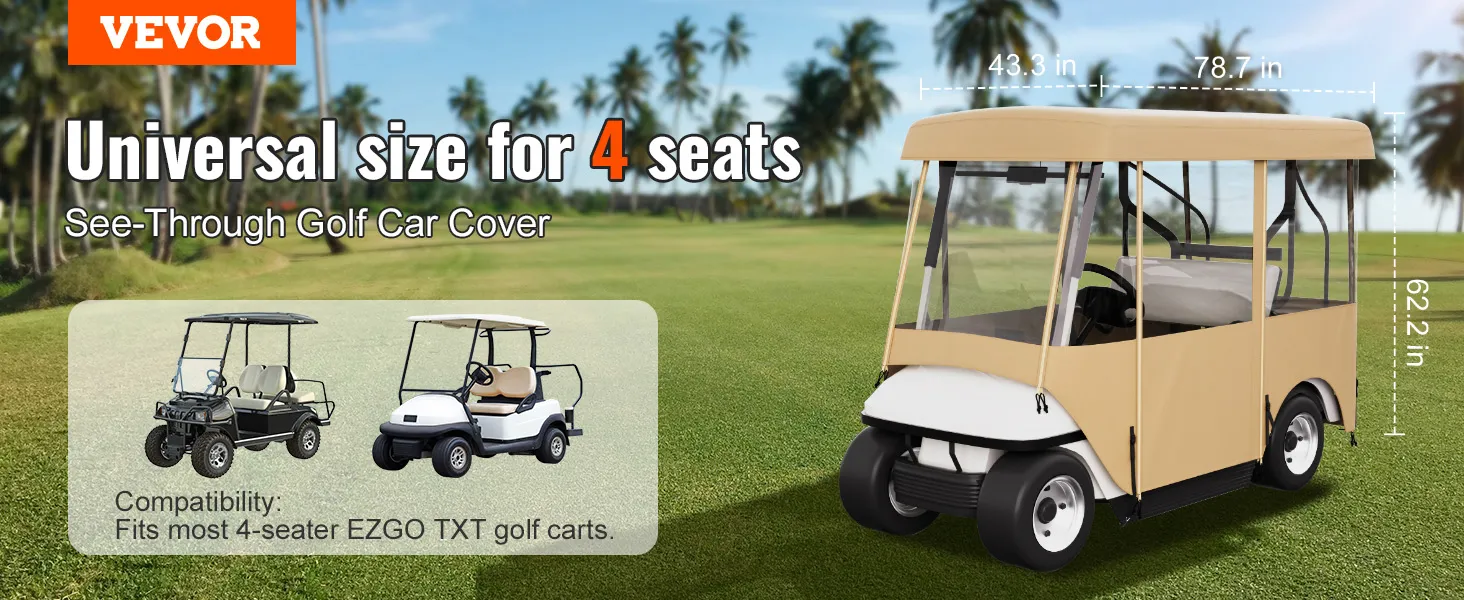 The VEVOR golf cart enclosure is the best partner for golfing in all weather! This enclosure is made to offer the best protection and comfort possible. It is designed for a 4-seat golf cart. This adjustable driving enclosure is made of 300D Oxford cloth with a PVC coating. It has a PVC window and a #10 resin zipper. It is durable, water-resistant, and ultraviolet-proof against wind and rain. It keeps the cart dry and clean. It turns your golf cart into a comfortable shelter with its quick installation process.