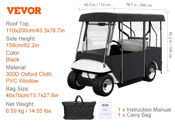 The VEVOR golf cart enclosure is designed to perfectly fit 4-Person golf carts. It ensures a snug fit, providing maximum comfort and protection. The precise dimensions make it easy to install and use. This enclosure keeps you dry and warm all year round. You can easily set it up with different models, including EZGO, Club Car, and Yamaha. Because of its compatibility with various models, this design makes it incredibly versatile. Your choice includes keeping your vehicle dry while being comfortable in winter or summer. An easy installation process that allows you to set the enclosure up quickly so that you spend less time fussing and more time enjoying your ride. The great protection against rain, wind, and cold enhances your golf cart experience.