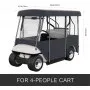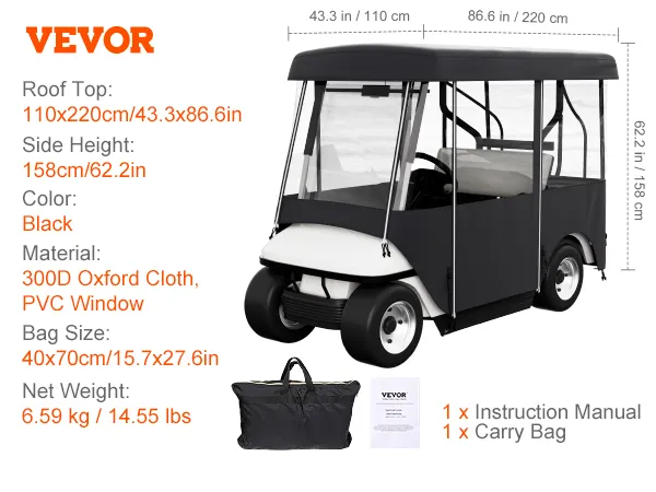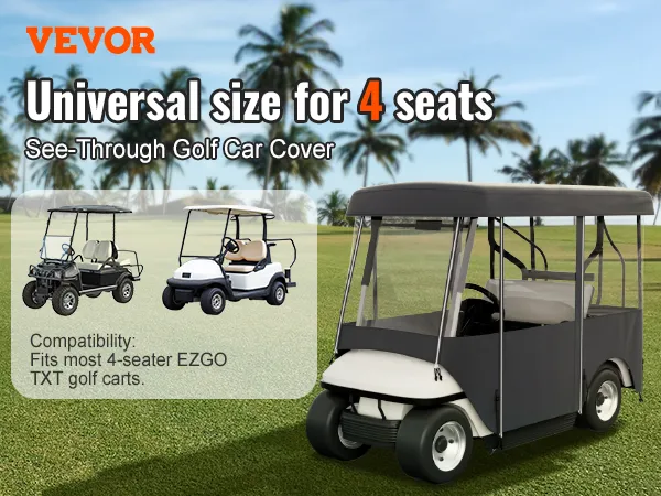 Ensure ultimate protection of your cart with the VEVOR golf cart cover. It features 300D Oxford cloth with PVC coating, a PVC window, and a #10 resin zipper. These are designed for long-lasting use, as they protect the golf cart from rain and wind. It is designed to seamlessly fit 4-seater golf carts. It is perfect for models including the EZGO, Club Car, and Yamaha. It offers unmatched protection during cold weather, and it features premium materials, clear windows, and an easy-to-access zipper. With its easy assembly, this 4-person golf cart cover is perfect for all weather conditions.