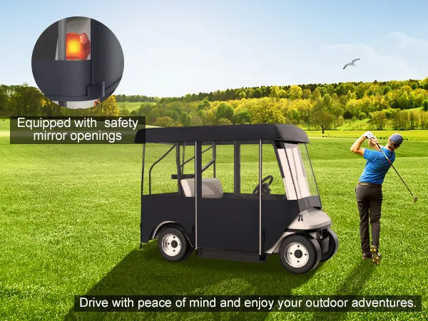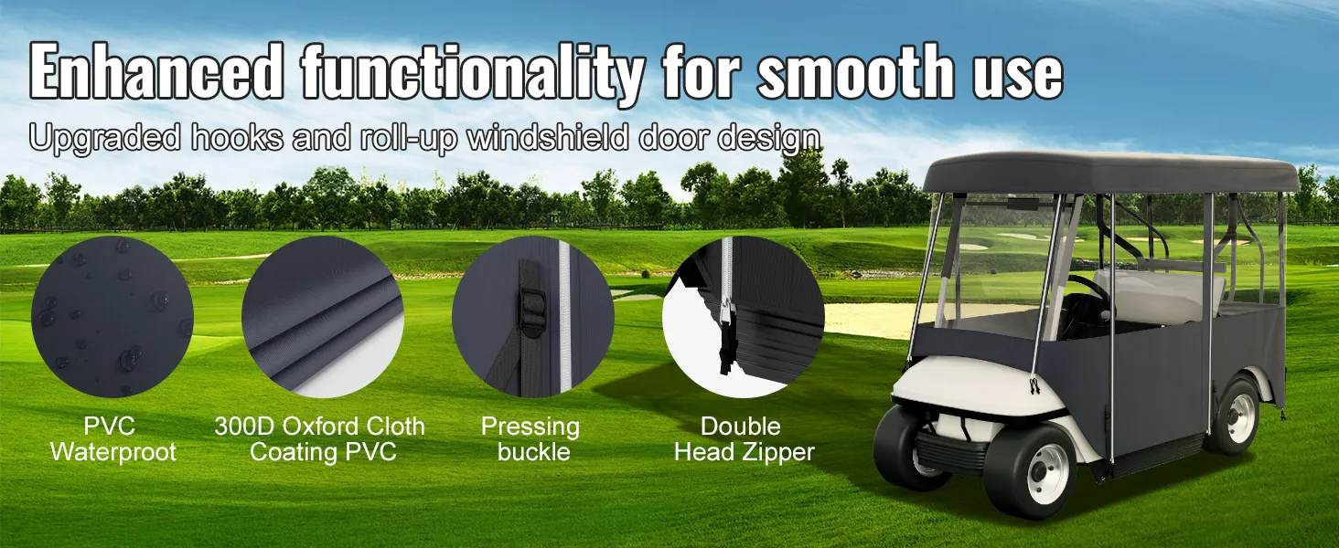 This golf cart driving enclosure protects golf cart from weather, UV rays, dust, and debris. It keeps the cart clean and prevents damage. It prevents theft, aids long-term storage, and helps maintain a comfortable temperature in the vehicle. It protects against scratches and cosmetic damage. Additionally, it protects the stroller from dirt from the road and damage during transport.