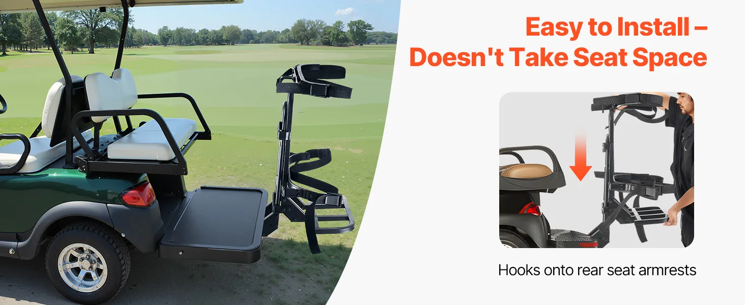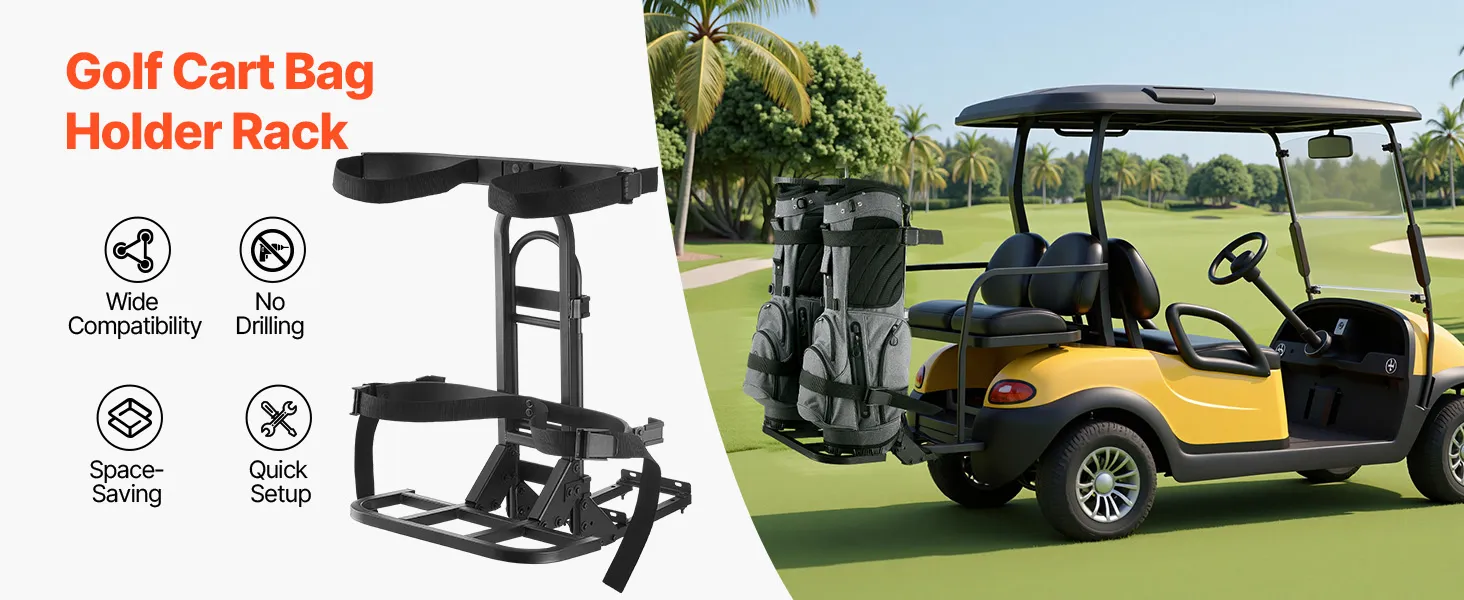 No-Drilling Installation: Our golf bag holder for golf cart installs instantly using straps around rear handrails—zero drilling or modifications required