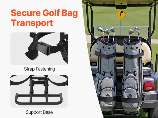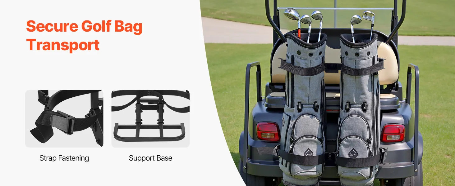 Holds Up to 2 Bags: Our golf cart rear seat bag holder secures two bags simultaneously with locking straps. Its oversized base prevents swaying during bumpy rides.