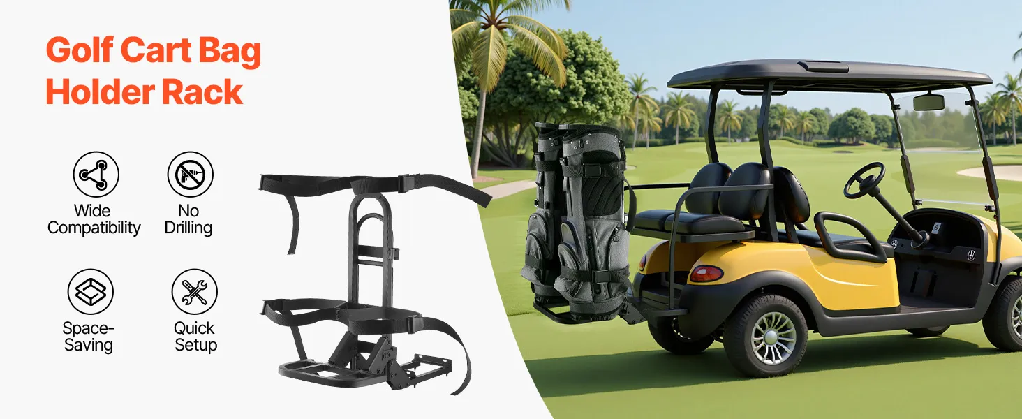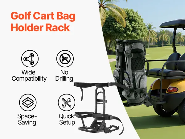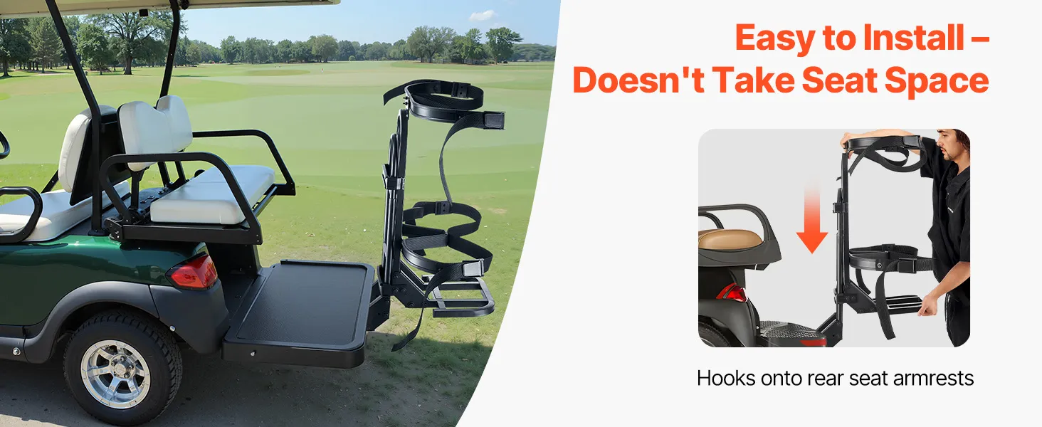 No-Drilling Installation: Our golf bag holder for golf cart installs instantly using straps around rear handrails—zero drilling or modifications required