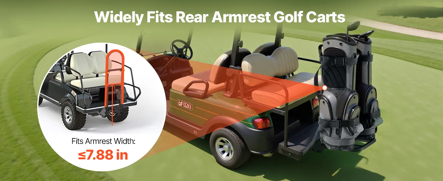 Wide Compatibility: This golf cart bag holder fits most golf carts with rear handrails (handrail width ≤7.88 inches), including EZGO, Club Car, and Yamaha models