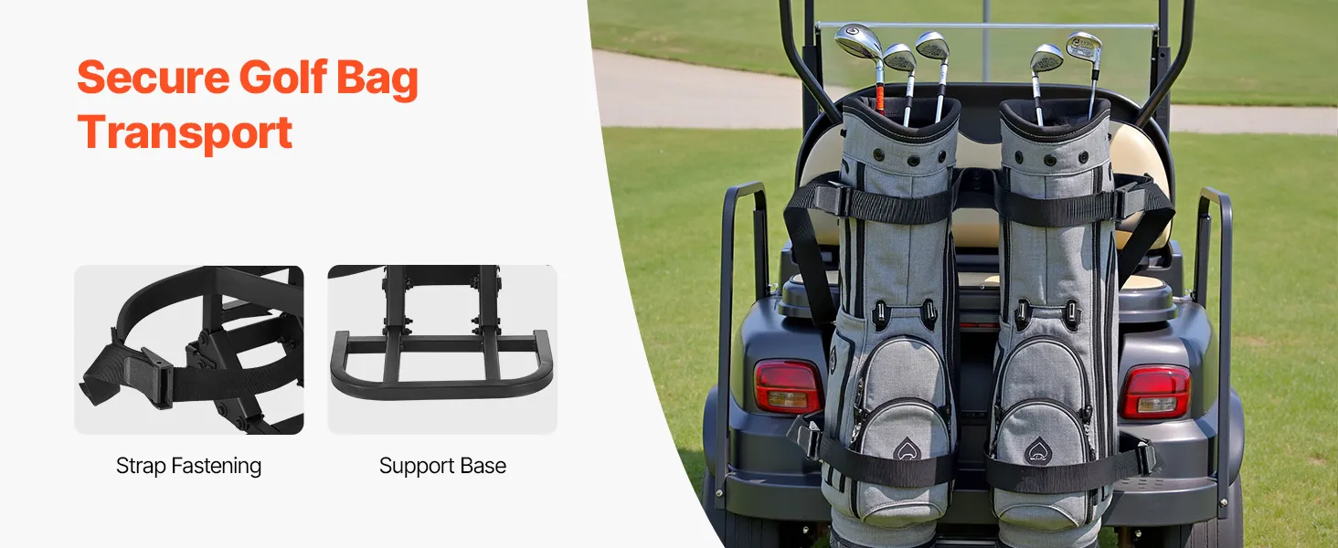Holds Up to 2 Bags: Our golf cart rear seat bag holder secures two bags simultaneously with locking straps. Its oversized base prevents swaying during bumpy rides.