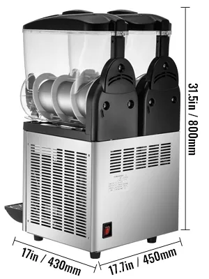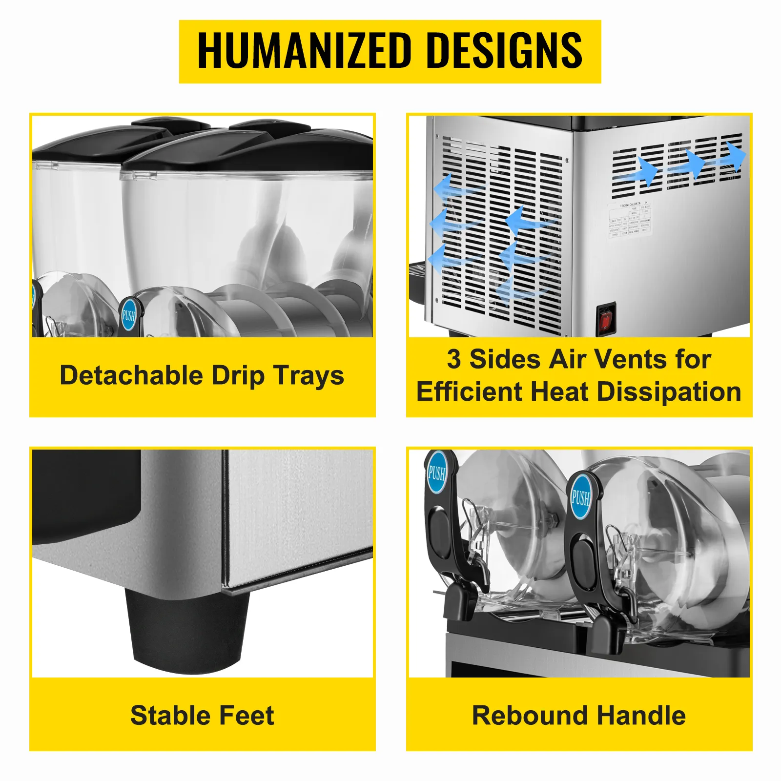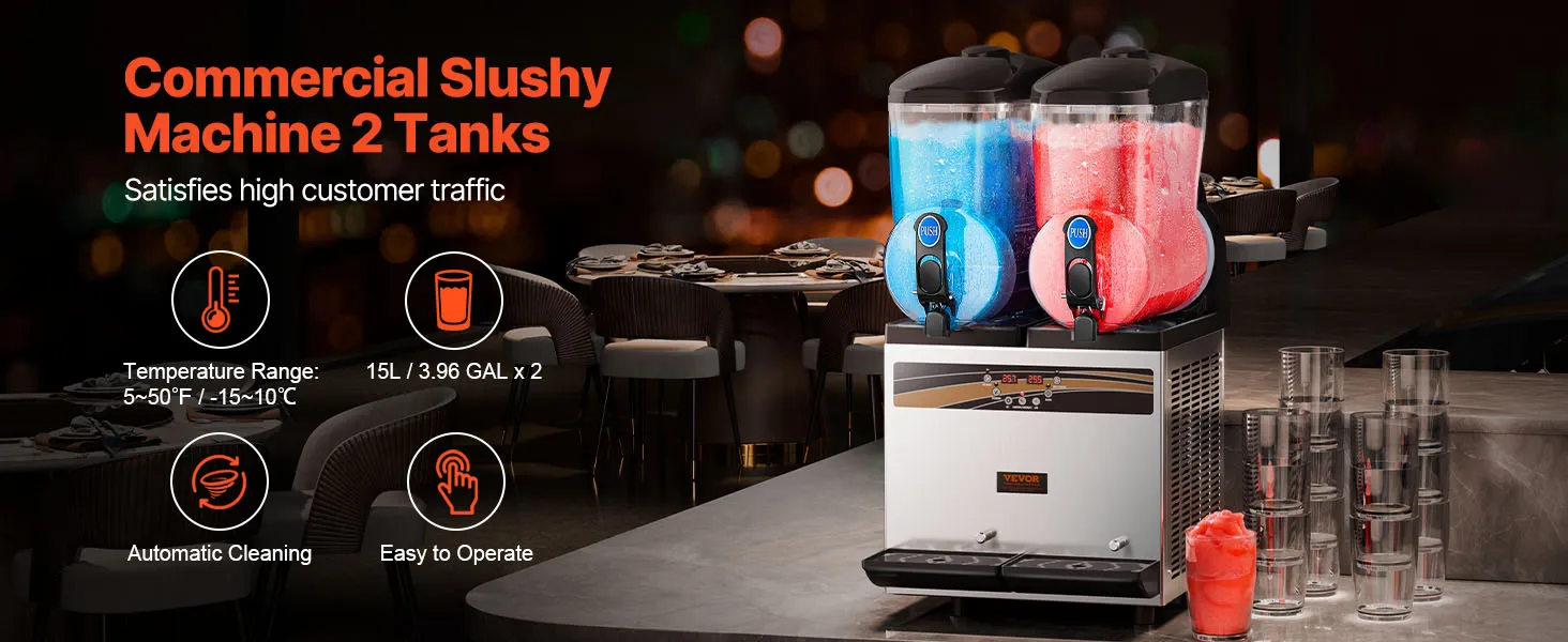 This commercial slushy machine features two 15L / 3.96 GAL capacity tanks, with a stainless steel body and PC tank, offering durable and healthy materials.