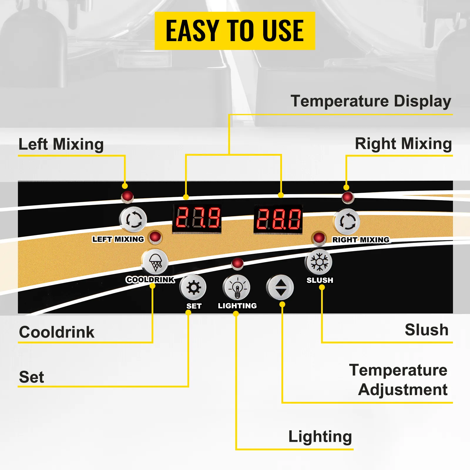 With intuitive icons and simple buttons, switching between operating modes is a breeze. The digital display makes it easy to monitor the slushy maker's status. The widened mixing stirrer rotates 360°, reducing sediment in all drinks.