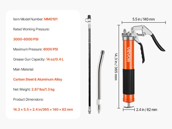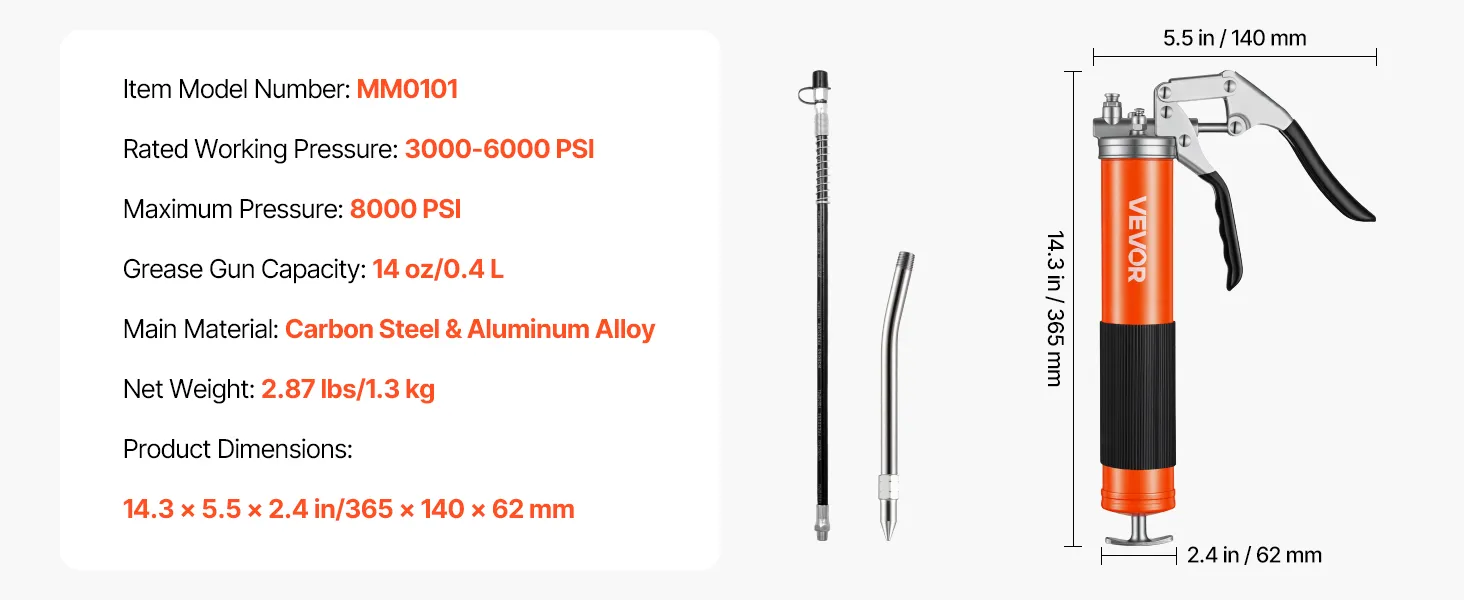 No fear of stickiness or rust! This 8,000 PSI 14 oz grease gun pushes smoothly, injects effectively, and ensures thorough maintenance without jamming.