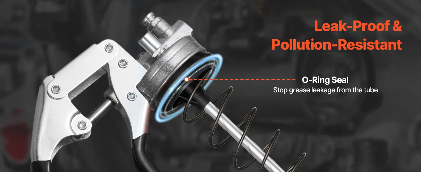 Reliable Sealing: A dual-sealing system—composed of an explosion-proof carbon steel tube and an o-ring piston ensures a tight seal from the gun head to the tub under high pressure. This design of our grease gun keeps hands and work conditions clean