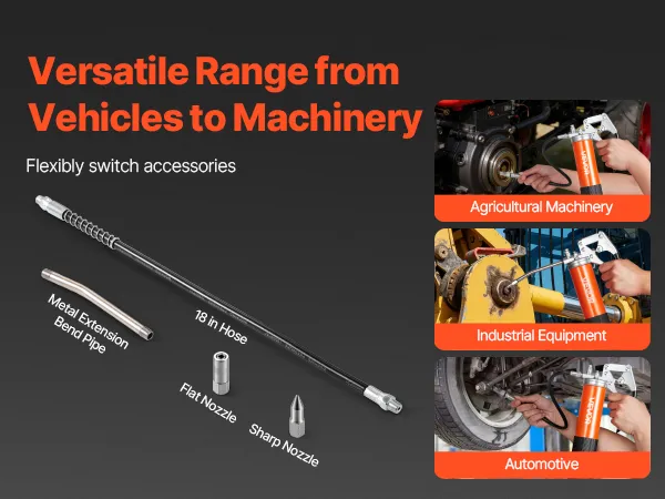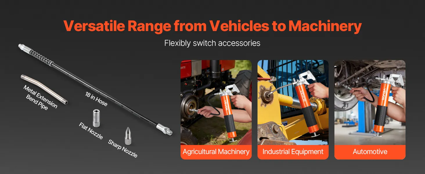 This pistol grip grease gun comes with a sharp nozzle, flat nozzle, bend pipe, and 18-inch hose–suitable for lubricating all equipment, from cars and agricultural machinery to bicycles.