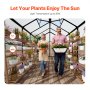 This polycarbonate greenhouse features a durable aluminum alloy frame and impact-resistant PC panels, with 89% light transmittance for UV resistance. The large opening doors and adjustable roof windows ensure effective ventilation, avoiding plant rot. It can function as a sunroom and garden room.