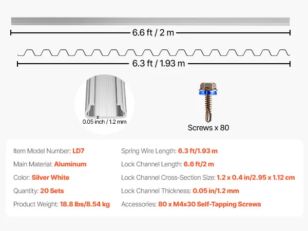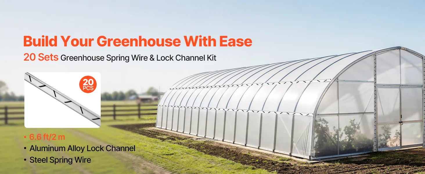 This greenhouse spring wire & lock channel set includes 20 spring wires and 20 lock channels. The aluminum alloy lock channels can be flexibly bent to fit your greenhouse frame, helping you build a stable and durable greenhouse.
