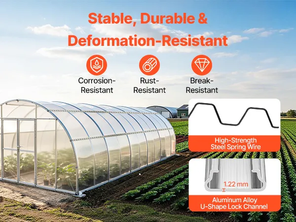 The 1.2 mm thick aluminum alloy lock channels are non-deformable and rust-resistant for outdoor use. The steel spring wire features a PE coating enhances corrosion resistance, preventing damage to the greenhouse film for long-term use.
