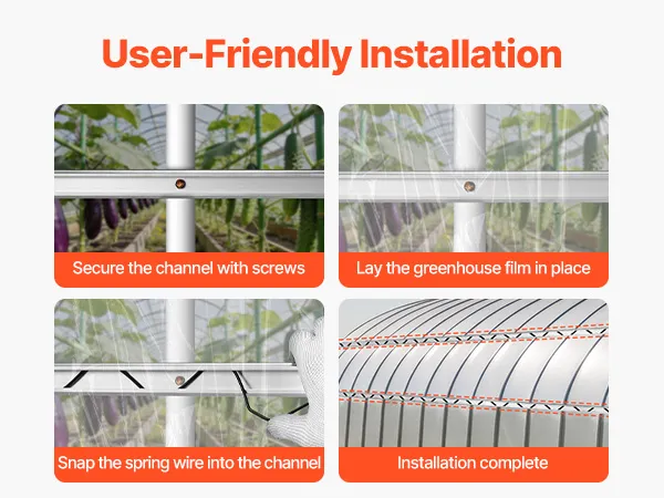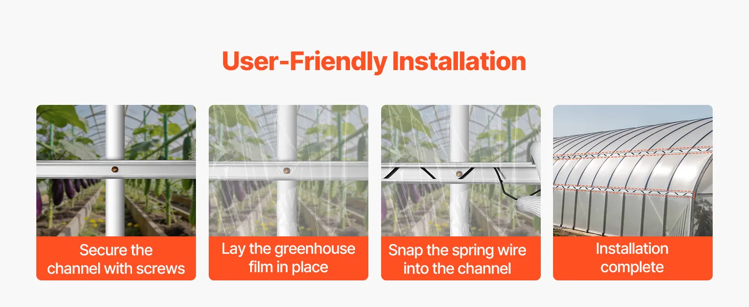 Easy Installation: Fix the lock channel to the greenhouse frame with screws, place the plastic film on it, and then press the spring wire into the channel. Included screws enhance installation efficiency significantly