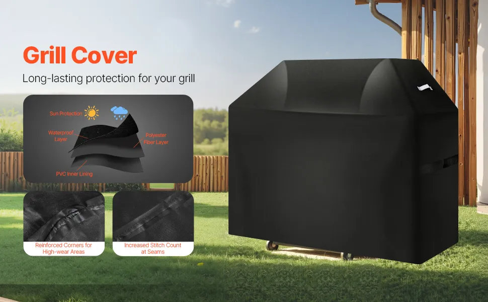 Constructed with 3 layers of high-quality materials: PVC lining, polyester fiber layer, and waterproof layer. This barbecue cover provides water resistance. The four corners are reinforced to resist wear and tear. The stitching is closely woven to enhance the waterproof performance.