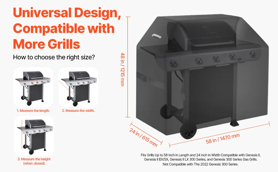 Fits covers up to 58 inch long and 24 inch wide, compatible with Genesis II, Genesis II EX/SX, Genesis II LX 300 series, and Genesis 300 series gas grills. Not compatible with the 2022 Genesis 300 series.