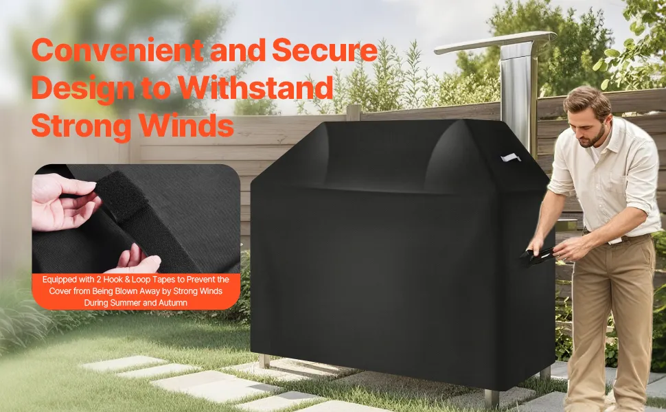 No more worrying about your grill cover blowing away during strong winds in the summer or autumn! This polyester easy on off cover is equipped with 2 pairs of hook & loop tapes for a quick, snug fit. Multiple windproof features ensure that your cover stays securely in place.