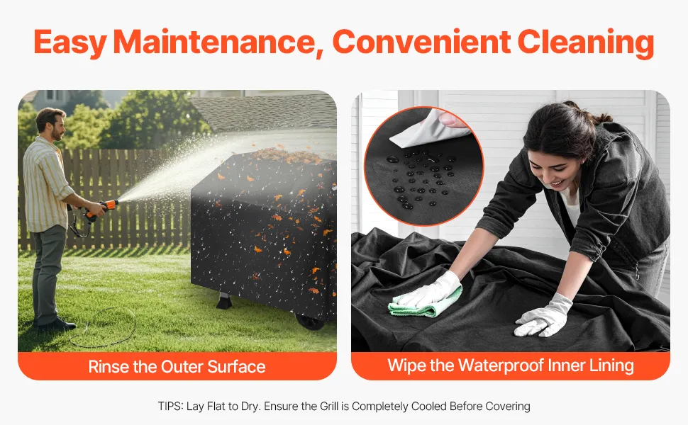 Simply rinse the outer surface and wipe the waterproof inner lining to easily remove stain. After cleaning, lay it flat to dry and it's ready for reuse. Tip: To extend the life of your grill cover, ensure your grill is completely cool before covering it.