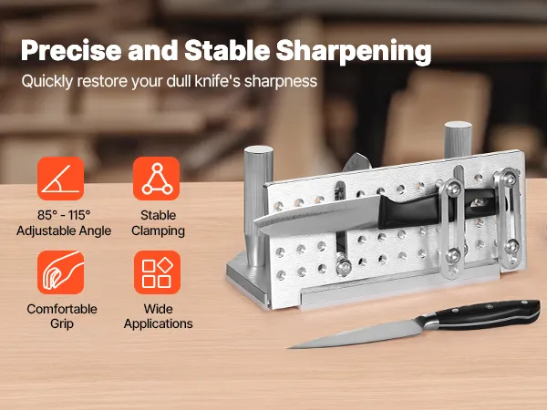 • Precise Angle Adjustment: The VEVOR knife grinding jig features a wear-resistant dial (85°-115°) for exact knife sharpening angle guide adjustments. Functioning as a professional knife bevel jig, it perfectly handles kitchen knives, outdoor blades, and craft knives, meeting precise bevel grinding needs for knife making