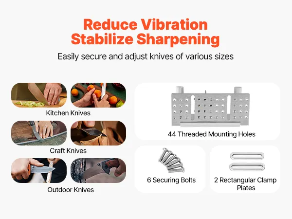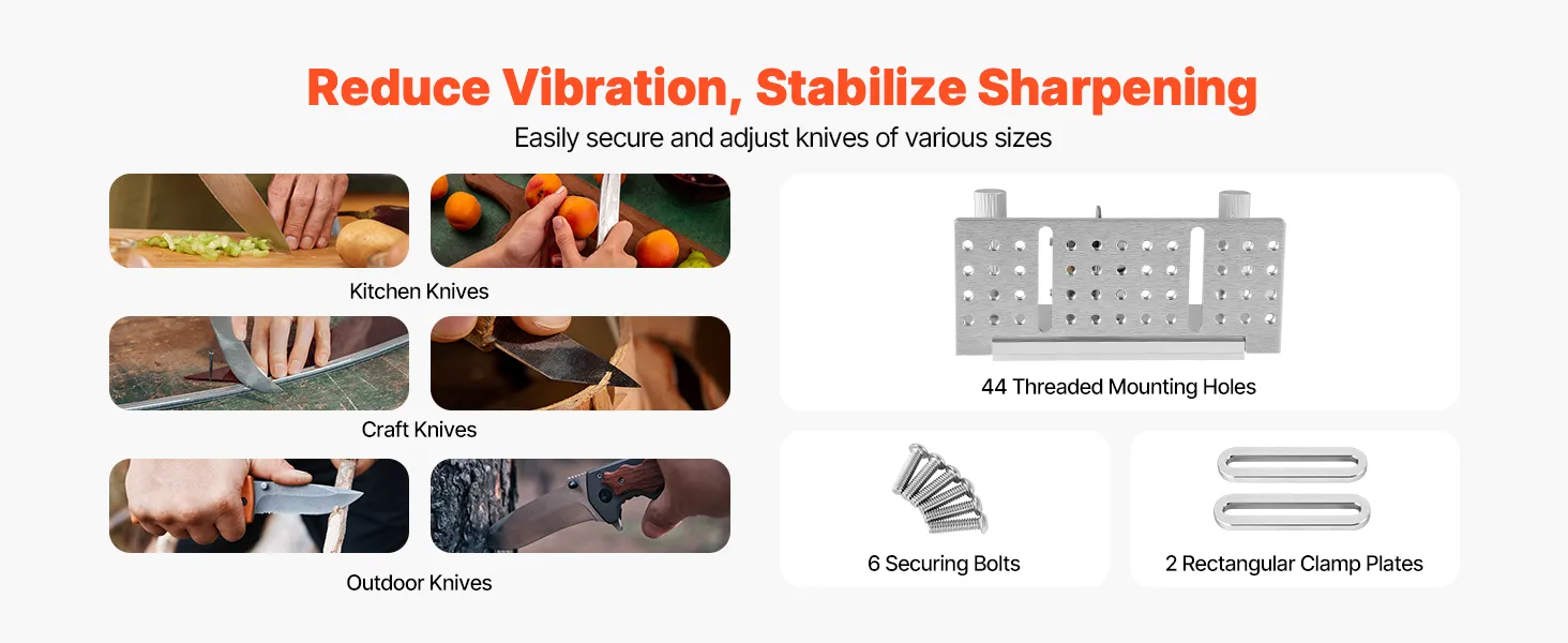 With 44 threaded holes, 6 securing bolts, and 2 rectangular clamp plates, the belt sander knife jig firmly holds knives — minimizing vibration and ensuring stable, precise sharpening for kitchen, craft, and outdoor knives.