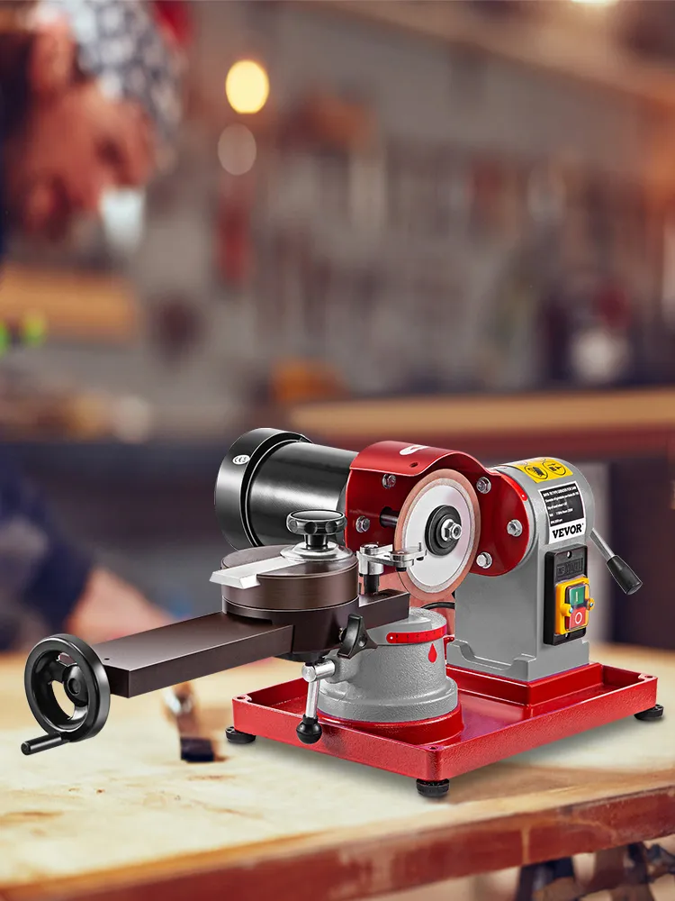 This rotary blade grinder features a rotating pallet for holding the saw blade, a precise scale for feed angle adjustment of high accuracy, and a waterproof switch button for safe operation.