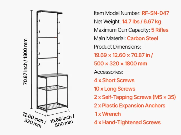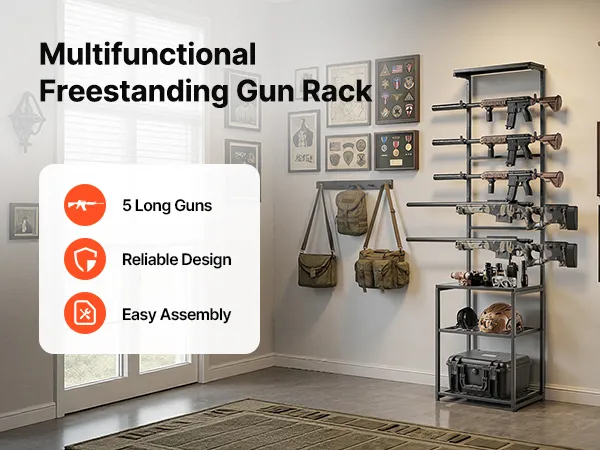 This compact floor standing wall mount gun rack holds 5 long guns and provides extra storage space for tactical accessories, ensuring secure storage, organized placement, and easy access.