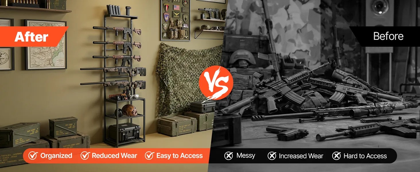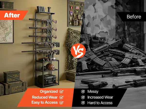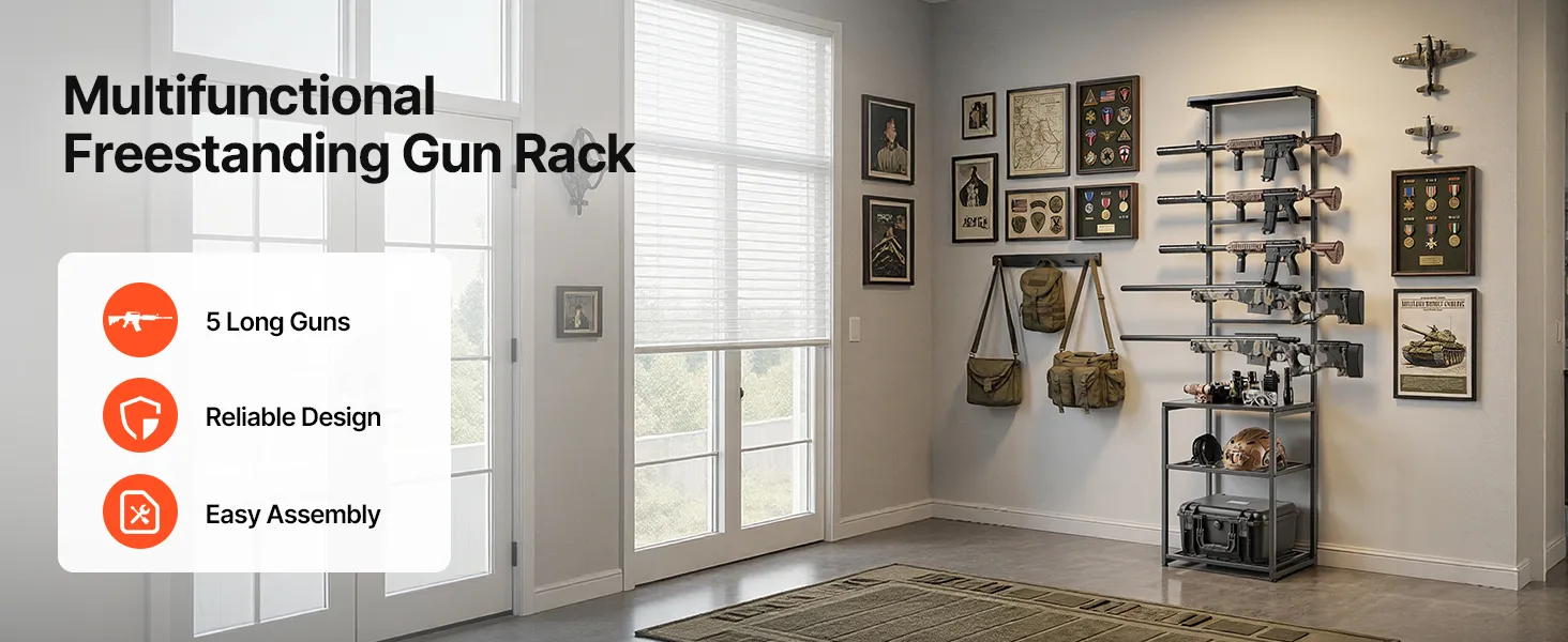 Organized Gun Storage: This compact freestanding wall mount gun rack holds up to 5 long guns and includes dedicated storage space for tactical accessories. It delivers organized storage, convenient access, and efficient use of indoor space
