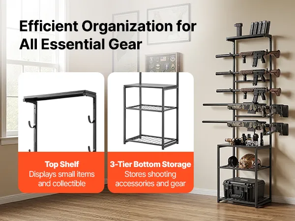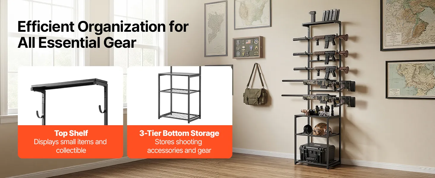 Efficient Storage Solution: Featuring a compact cabinet-style design, the floor standing gun rack includes a top display area for medals or collectibles. Its 3 lower shelves hold tactical tools and shooting accessories, such as helmets, earmuffs, and gear