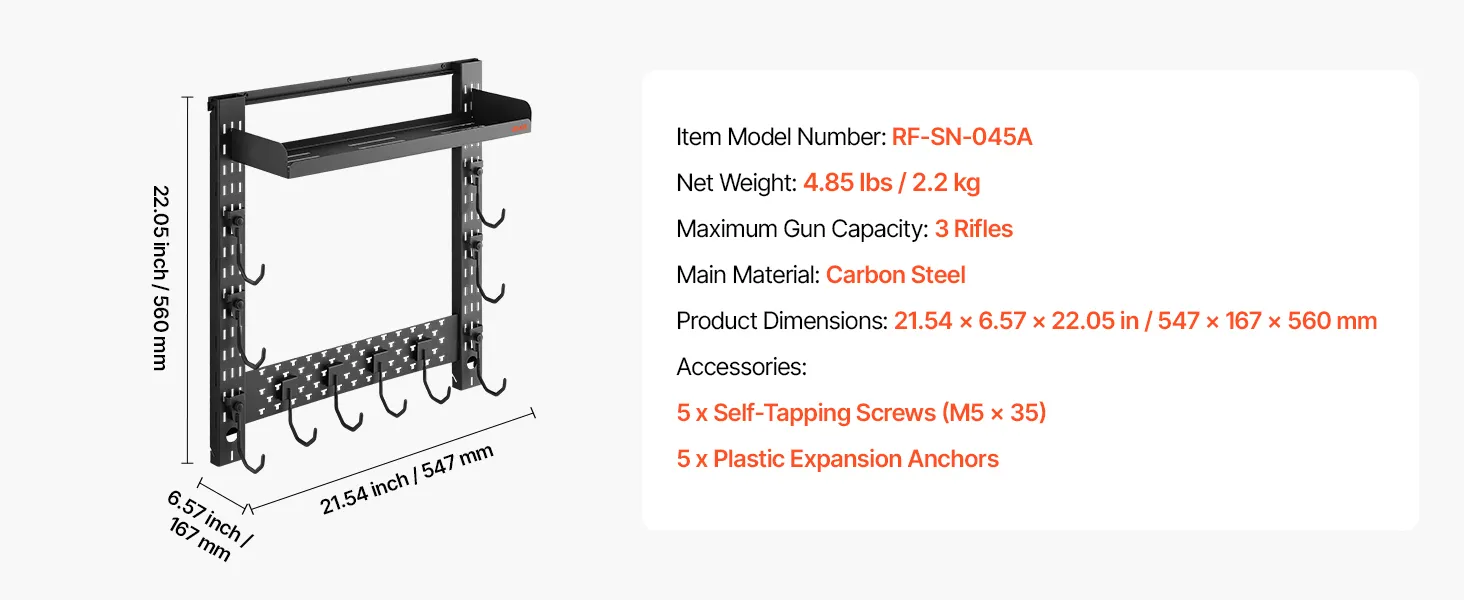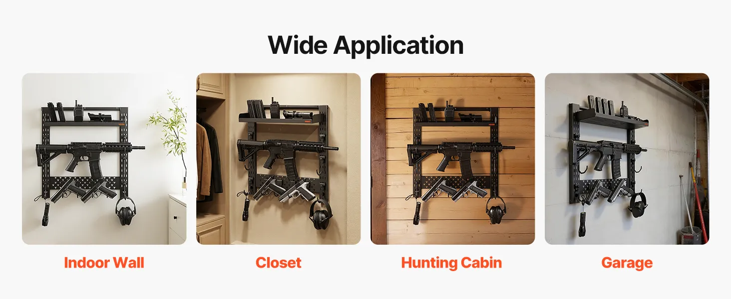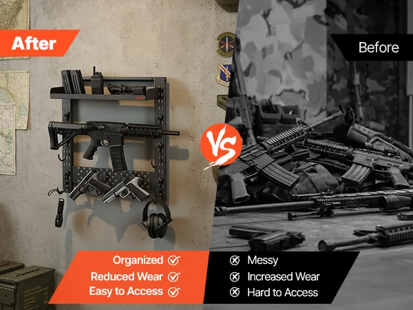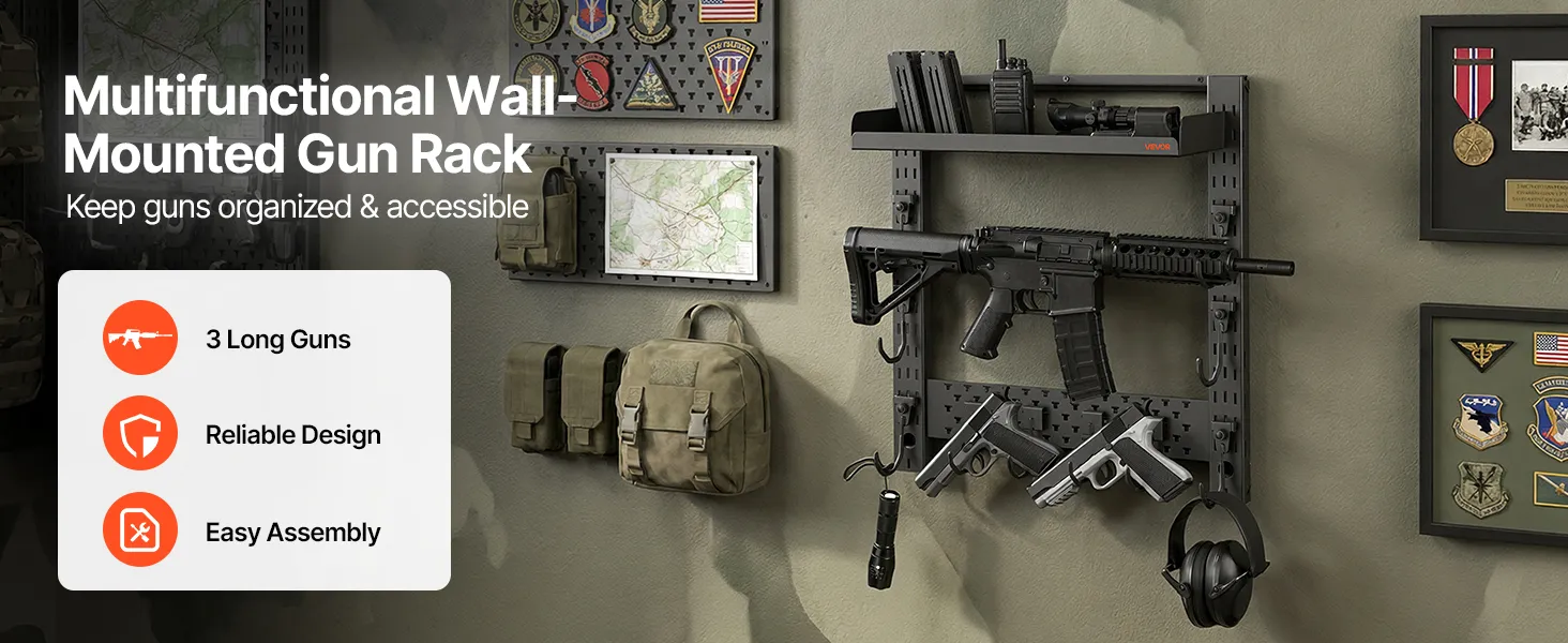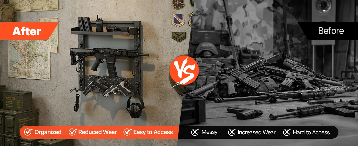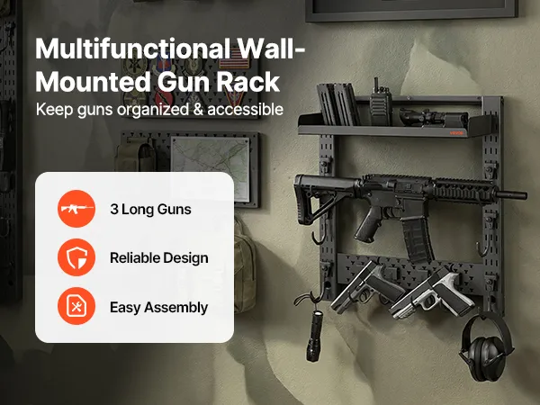 Organized Gun Storage: This wall-mounted gun rack holds up to 3 long guns and includes dedicated hooks for tactical accessories. It delivers organized storage, convenient access, and efficient use of indoor space