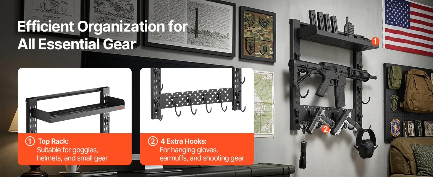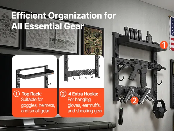 Efficient Storage Solution: Designed with a top tray and additional hooks, the wall mount gun rack provides storage for tactical gear, helmets, and goggles, significantly improving storage efficiency