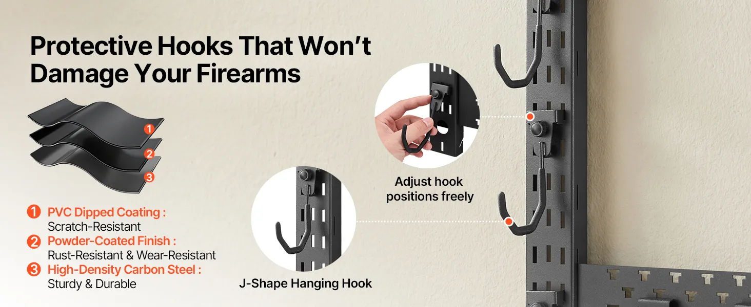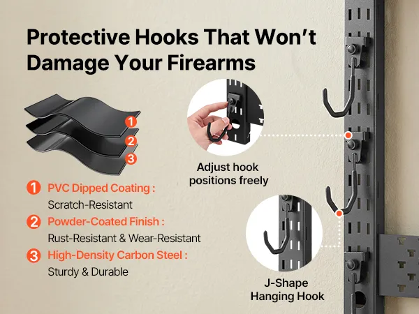 Featuring powder-coated, PVC-coated J-shaped hooks, the rifle shotgun rack holds firearms securely while minimizing scratches and slippage. It keeps firearms in excellent condition during long-term storage.
