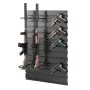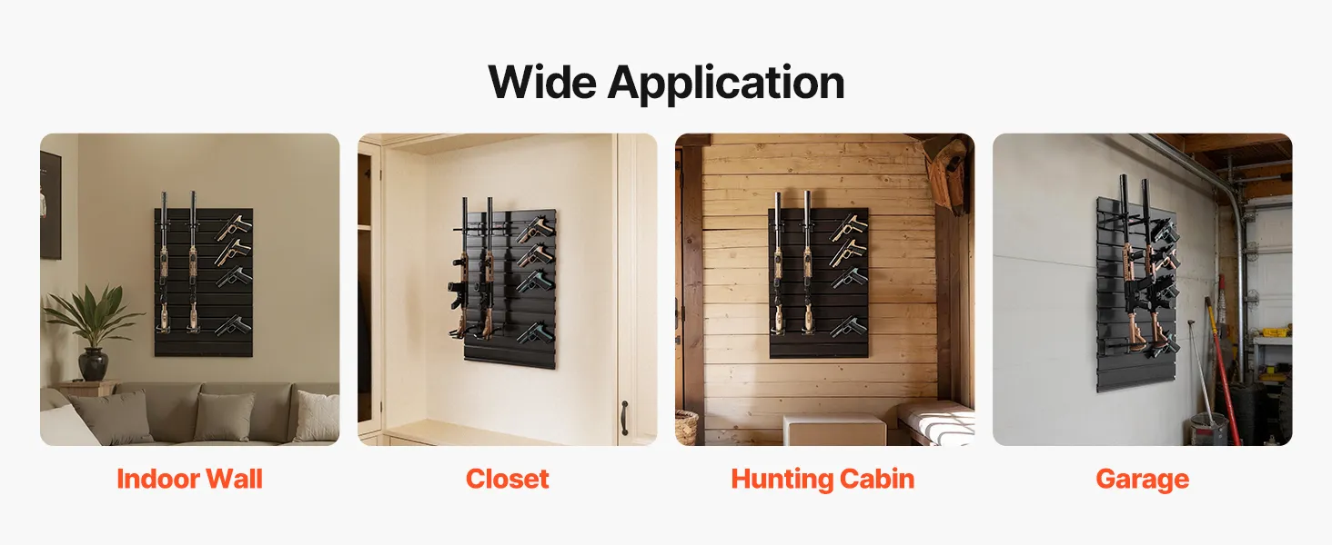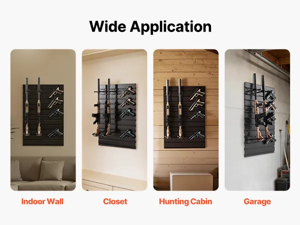 Our wall mount gun rack features a slotted back panel with guide rails for easy hook adjustment. It can be flexibly configured to fit different firearms and accessories based on storage needs.