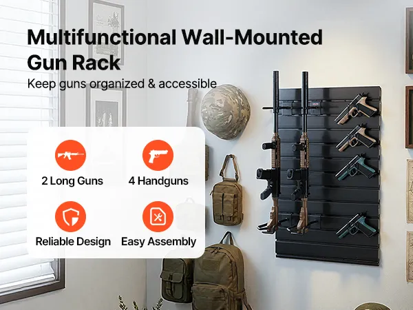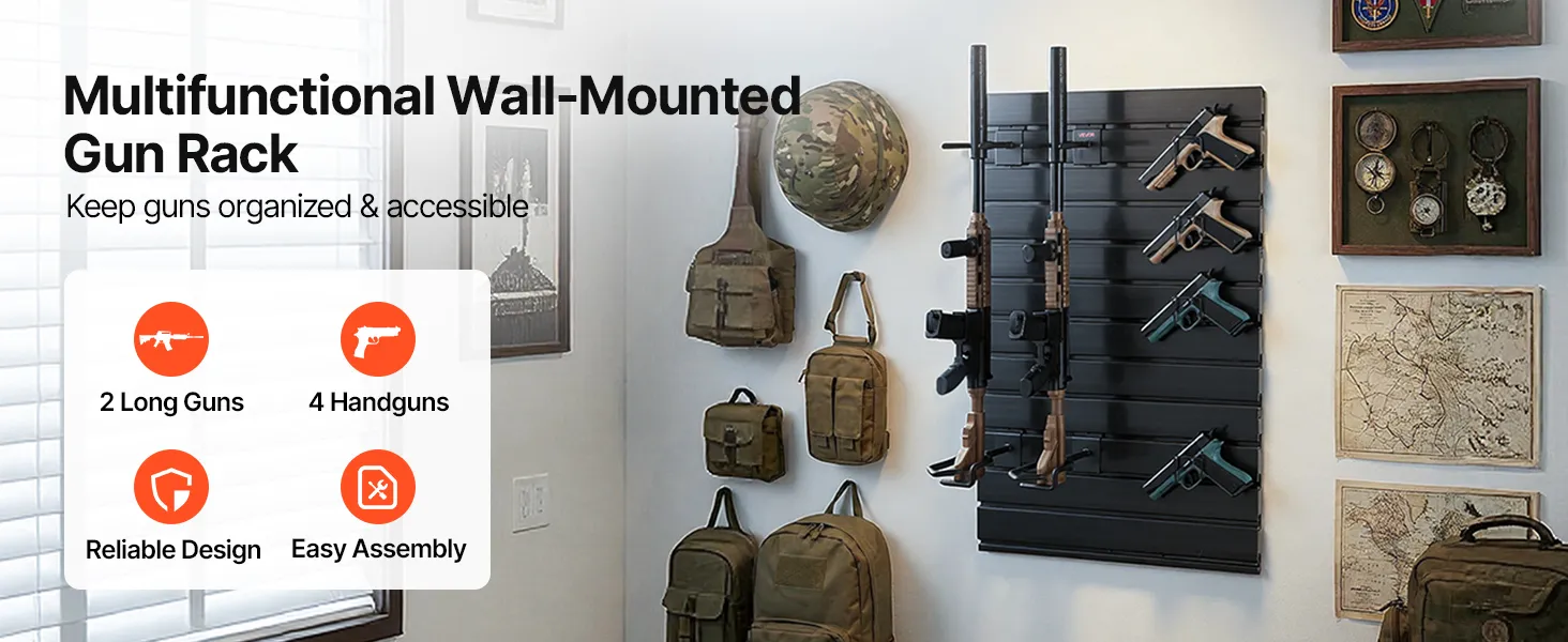Organized Gun Storage: This wall-mounted gun rack holds up to 2 long guns and 4 handguns. It provides dedicated hooks for tactical accessories, delivering organized storage, convenient access, and efficient use of indoor space