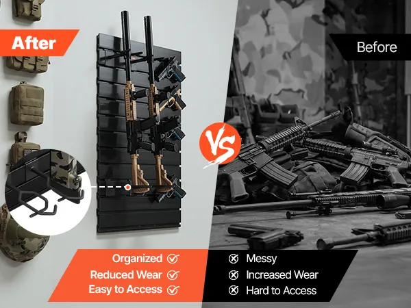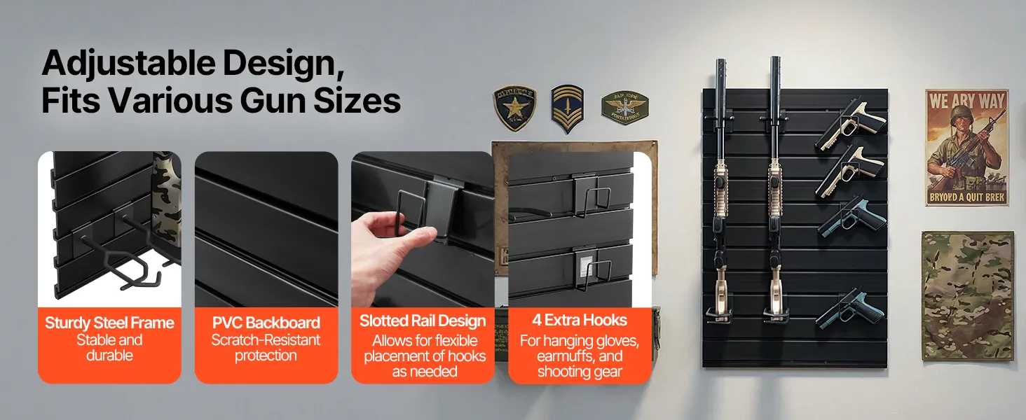 Flexible Storage Solution: Our wall mount gun rack features a slotted rail backboard, allowing hooks to be adjusted to accommodate different firearms and accessories. It also maintains a neat and organized layout