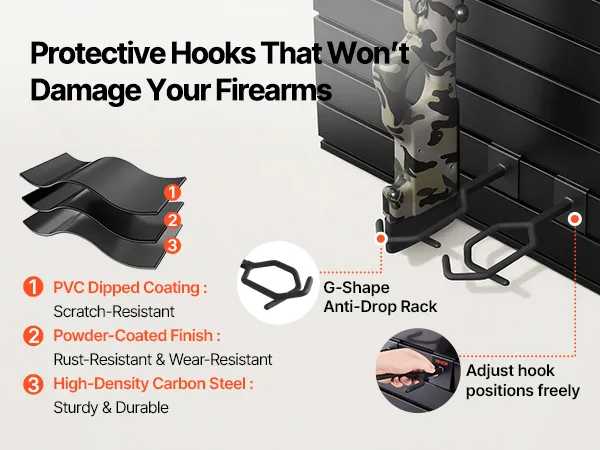 Protective Support: The G-shaped hooks of this rifle gun rack feature a powder-coated finish with PVC dipping, helping reduce slippage and scratches. It supports long-term firearm care during indoor storage