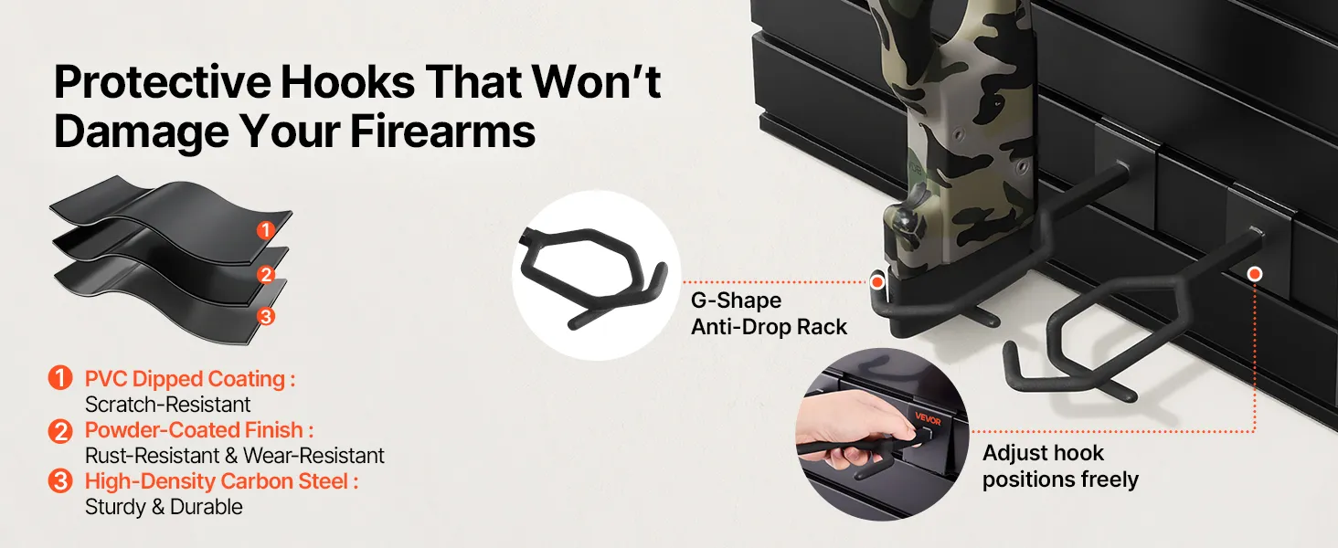 Equipped with powder-coated and PVC-coated G-shaped hooks, the rifle shotgun rack secures firearms while minimizing scratches and slippage. It keeps firearms in excellent condition during long-term storage.