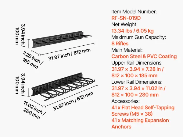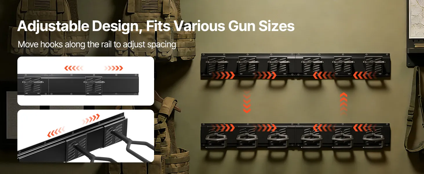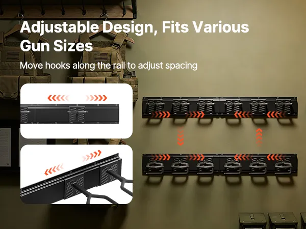 Adjustable Spacing: Featuring separated upper and lower panels with adjustable spacing, the rifle gun rack efficiently stores firearms of different types and lengths