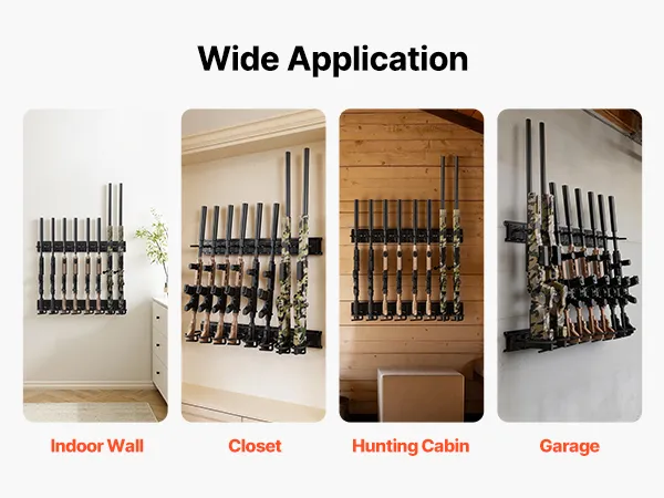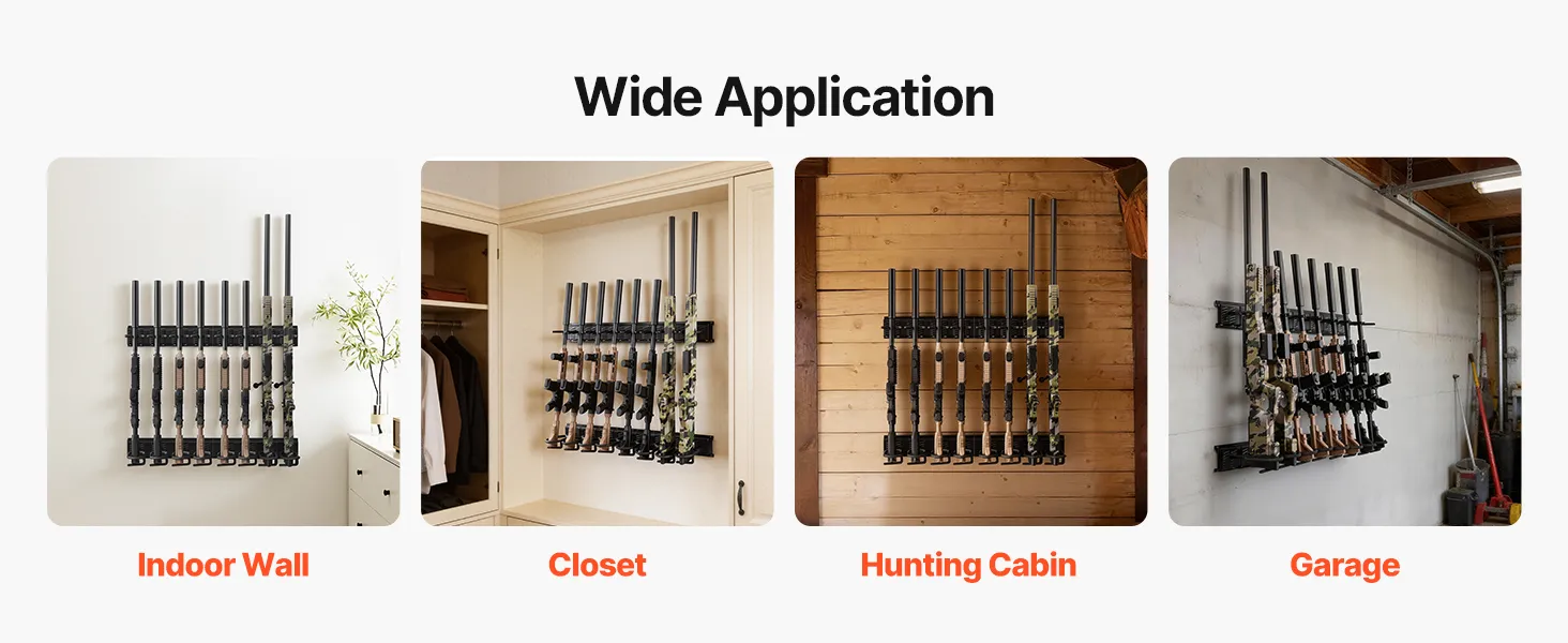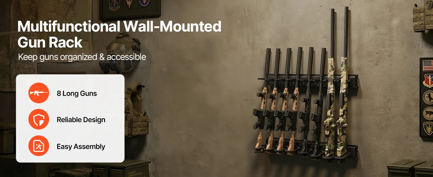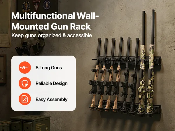 Organized Gun Storage: This wall-mounted gun rack holds up to 8 long guns, keeping firearms neatly organized and easily accessible. It makes efficient use of indoor storage space