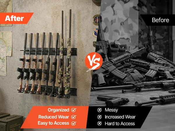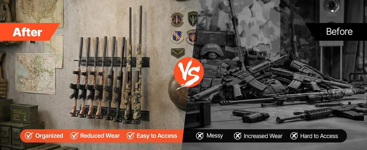 Say goodbye to cluttered storage that can cause wear and damage to your firearms and make access difficult. Our rifle gun rack keeps your guns and tactical gear neatly arranged, securely stored, and always within easy reach.