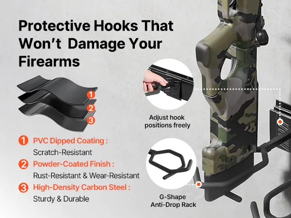 Protective Support: The G-shaped hooks of this wall mount gun rack feature a powder-coated finish with PVC dipping, helping reduce slippage and scratches. It supports long-term firearm care during indoor storage